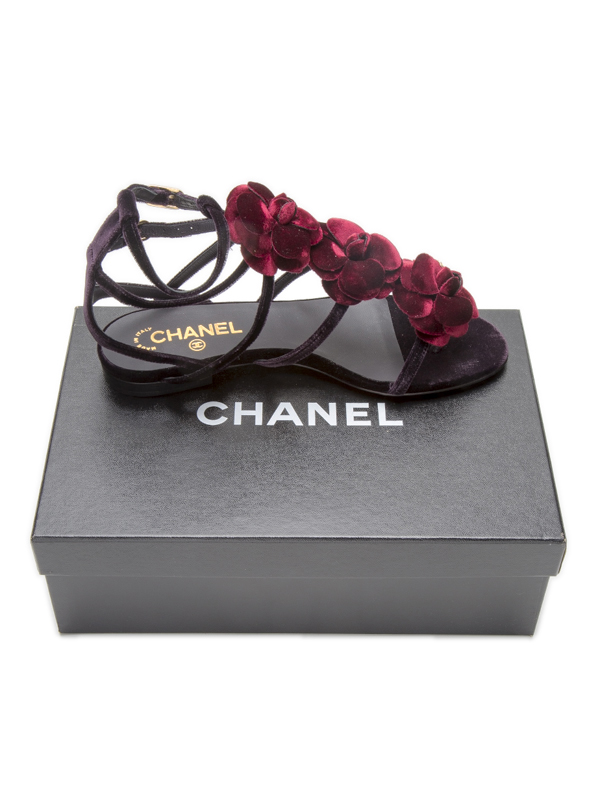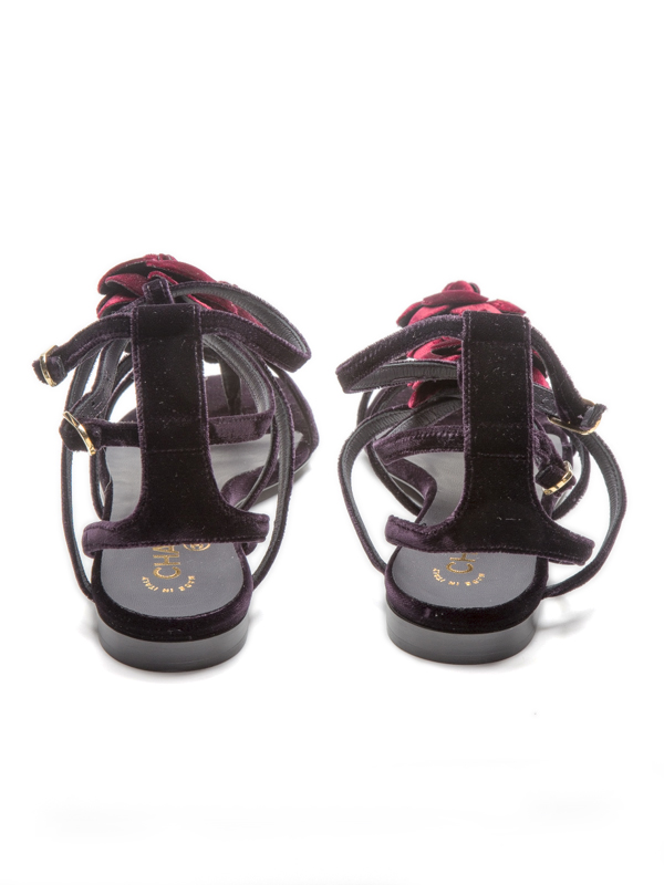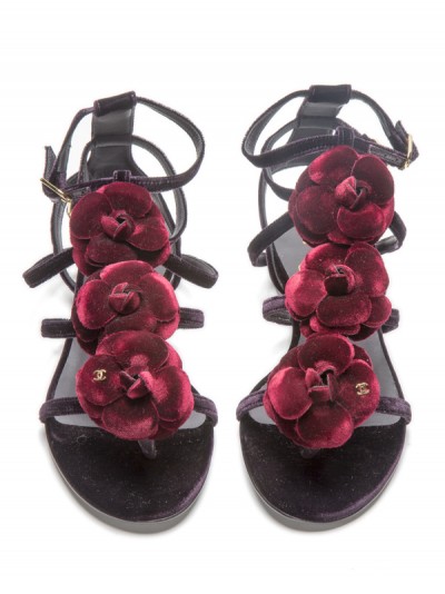 Planas y divinas!Estas preciosas sandalias de piel negra y adornada con camelias en un intenso fucsia de terciopelo serán tus aliadas para las tardes de verano.Como siempre, Chanel acierta! Número 38 En perfecto estado.