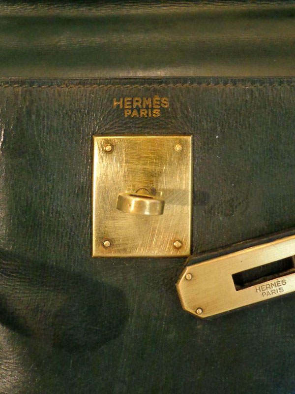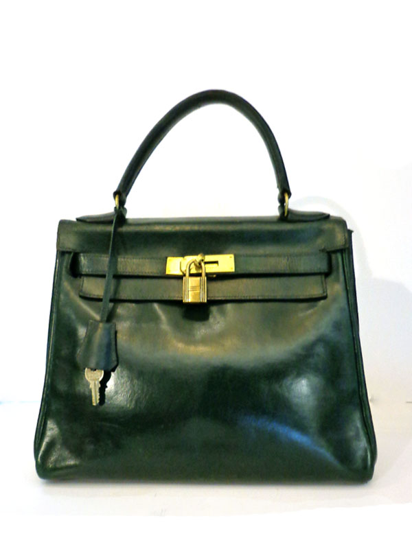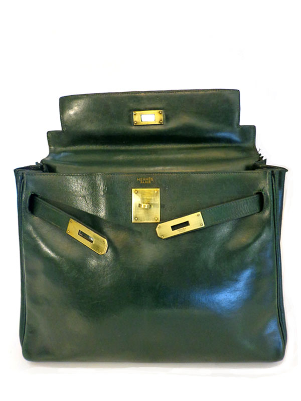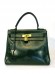 Vintage Kelly de piel verde. Tiene condado, dos llaves y su caja original. Año 60. 28 cm de largo, 22 cm de alto con fuelle de 11 cm. En su estado.